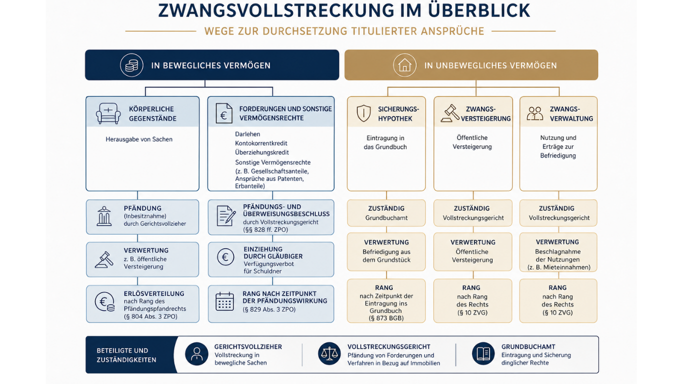 Die Zwangsvollstreckung differenziert sich maßgeblich nach dem Vollstreckungsgegenstand. Die auf dem beigefügten Schaubild dargestellte Übersicht verdeutlicht diese grundlegende Struktur: